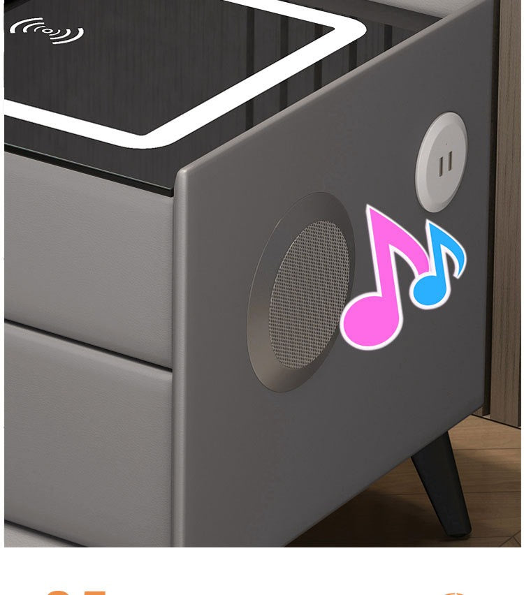 This multifunctional bedside table is made of solid wood and features wireless charging and LED ambient lighting. It includes a Bluetooth dual sound system and a secure fingerprint lock supporting up to 20 fingerprints. The table has two drawers and USB interfaces for convenient charging on both sides. Perfect for bedroom use with modern simplicity and practical features.